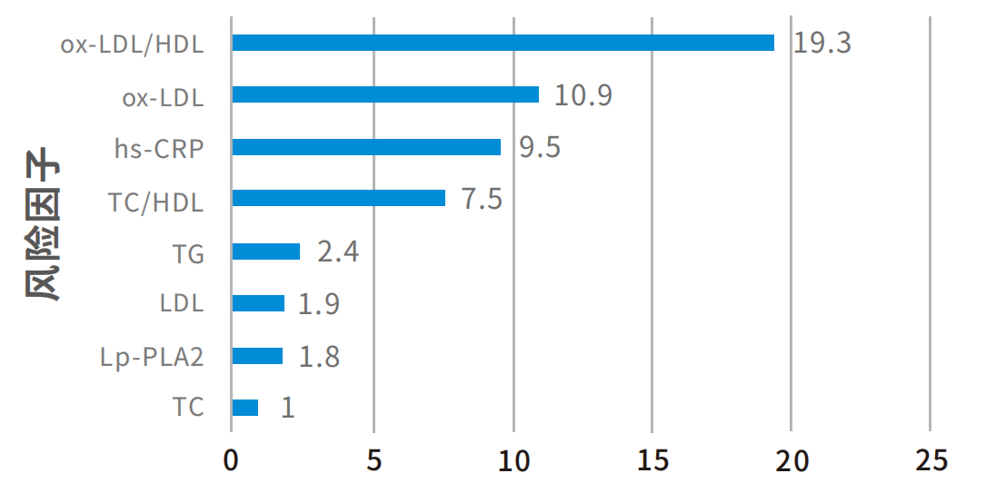 如將TC對(duì)心血管疾病的診斷的有效性定義為1,則ox-LDL為10.9,ox-LDL/HDL為19.3,ox-LDL檢測(cè)有效性明顯提升。