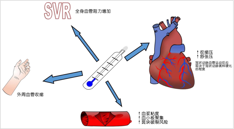 脂代謝異常、氧化應(yīng)激和炎癥反應(yīng)亢進(jìn)被認(rèn)為是動脈粥樣硬化發(fā)展的核心因素,已有大量研究證明寒冷能影響機(jī)體脂代謝、激活氧化應(yīng)激和引起免疫反應(yīng)亢進(jìn),提示寒冷與動脈粥樣硬化發(fā)展高度相關(guān)。且相關(guān)研究顯示與長期嚴(yán)寒的地區(qū)相比,溫暖地區(qū)的冷暴露會導(dǎo)致更高的心肌梗死風(fēng)險。這表明急性冷暴露可能是心肌梗死發(fā)生的重要危險因素。