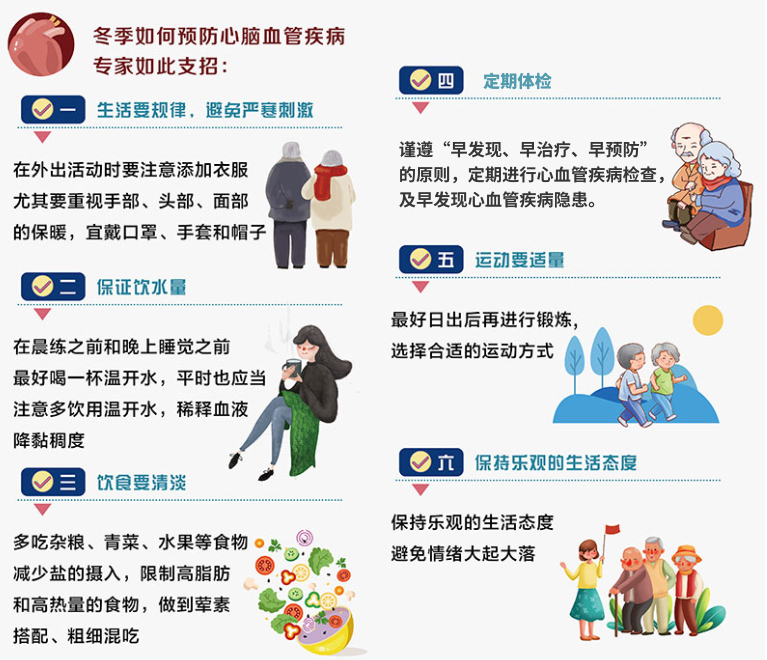 保暖是健康過冬的首要措施,外出活動務(wù)必及時增添衣物,戴好帽子口罩。適度運(yùn)動可以加速汗液排出,促進(jìn)水分的攝入。但室外活動不宜過早,冬季早晨的氣溫低,過早進(jìn)行室外運(yùn)動很容易會受寒著涼,甚至引發(fā)感冒,導(dǎo)致心腦血管疾病發(fā)作。