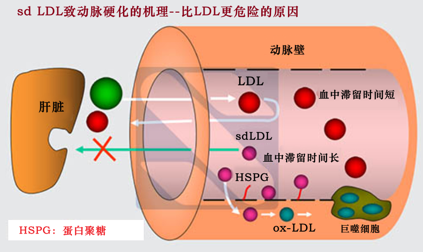 4)易粘附:體外研究發(fā)現(xiàn)sdLDL易與血管壁上的蛋白多糖結(jié)合,從而粘附在血管壁上。如果發(fā)生在體內(nèi),則粘附的sdLDL很可能通過某種途徑進(jìn)入人血管內(nèi)皮細(xì)胞,在細(xì)胞多種氧化酶的作用下,sdLDL在血管壁內(nèi)發(fā)生氧化修飾,從而誘發(fā)動脈粥樣硬化、冠心病等多種疾病的發(fā)生。