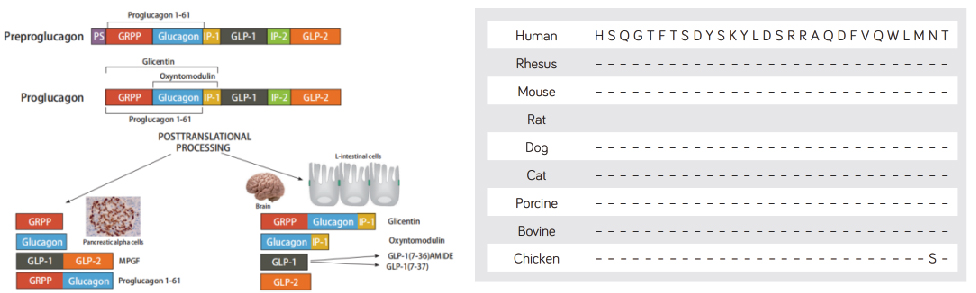 ①氨基酸少,并且衍生物同源性極高【胰高血糖素(1-29)是通過用激素原轉化酶2處理胰高血糖素原產生的 ,分子量為3485Da ;胰高血糖素樣肽-1(GLP-1),胰高血糖素樣肽-2(GLP-2),腸高血糖素和胃泌酸調節(jié)素來源于激素原轉化酶1處理的胰高血糖素原】 。