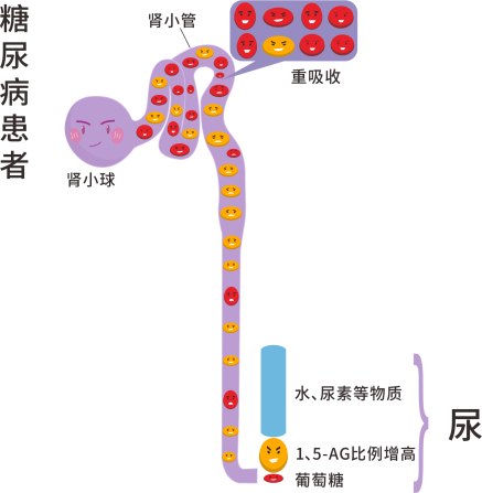 1,5-AG在腎小球中排出,卻被腎小管近99.9%重吸收【2】。這種重吸收機制與尿葡萄糖相同,當腎小管上的尿葡萄糖過量時,則1,5-AG的重吸收就會被競爭性抑制【4,5】。糖尿病患者在高血糖狀態(tài)下終尿排泄的1,5-AG增加導致了血清的1,5-AG減少。