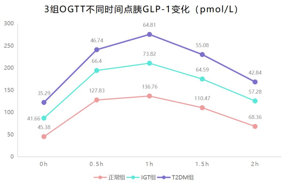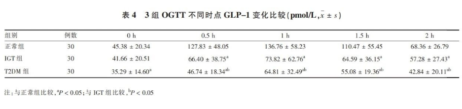 T2DM組在各時(shí)點(diǎn),IGT組在0.5h、1h、1.5h、2h的平均GLP-1低于正常組,T2DM組在0.5h、1h、1.5h、2h的平均GLP-1低于IGT組,組間差異有統(tǒng)計(jì)學(xué)意義(P<0.05)。