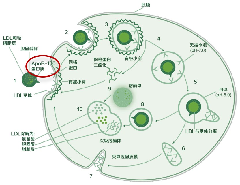 在正常情況下,天然LDL由LDL受體識別。LDL和LDL受體結合后,內吞入細胞,與溶酶體結合。在溶酶體酶的作用下,蛋白質降解為氨基酸,膽固醇酯水解為游離膽固醇和脂肪酸。此受體受到細胞內膽固醇含量的下降調節,當細胞內膽固醇的含量增多時,LDL受體的量便會減少。所以,天然LDL經這一途徑代謝,不會引起膽固醇酯在細胞內堆積。