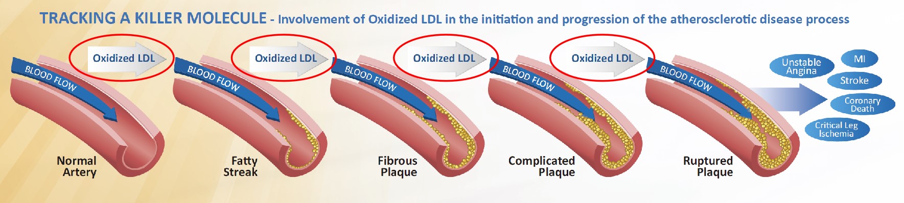 氧化低密度脂蛋白(ox-LDL)是低密度脂蛋白(LDL)的致動脈粥樣硬化形式,它是一種斑塊特異性脂蛋白,在動脈粥樣硬化疾病過程中起著關鍵作用。氧化型低密度脂蛋白主要存在于動脈粥樣硬化斑塊中,而非正常動脈中,它直接參與動脈粥樣硬化的發生和發展:從單核細胞/巨噬細胞早期轉化為泡沫細胞,到斑塊不穩定和破裂的晚期階段。
