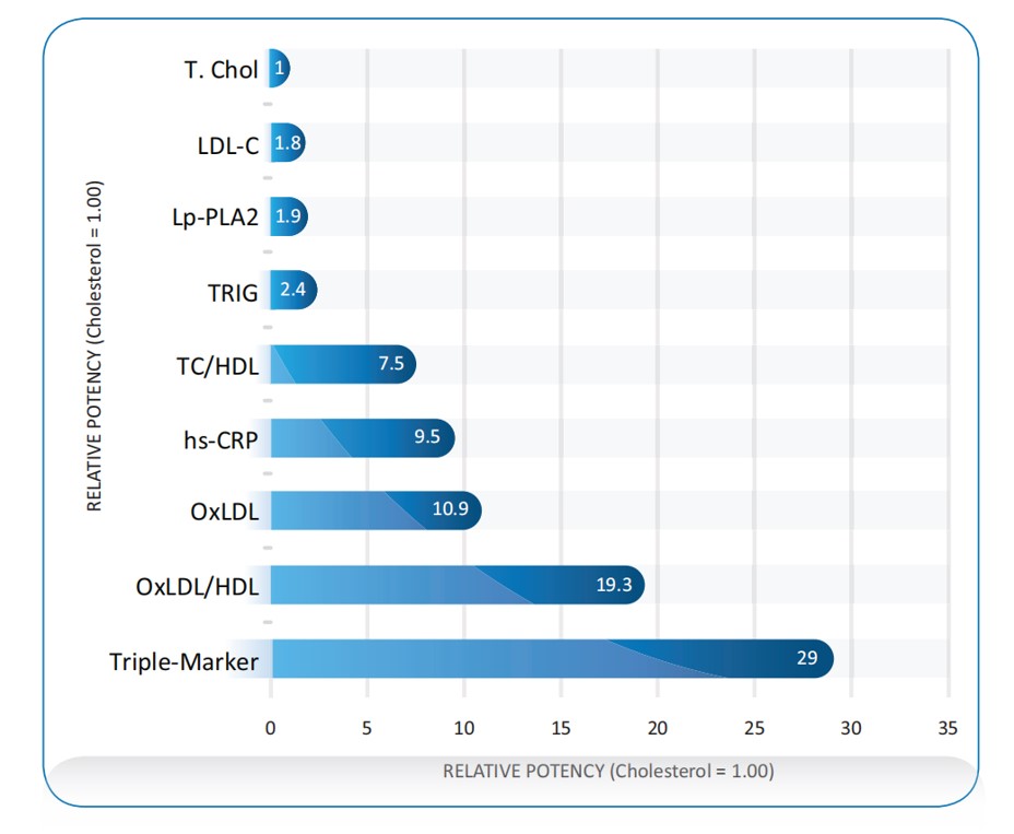 美國Shiel醫學實驗室所做的生物標志物對冠狀動脈疾病患者的相對有效性研究表明,將總膽固醇(T.Chol)對于心血管事件的有效性定義為1,則LDL-C為1.8,ox-LDL為10.9,ox-LDL三聯檢(ox-LDL / HDL * hs-CRP)為29,ox-LDL檢測的有效性大幅提升。