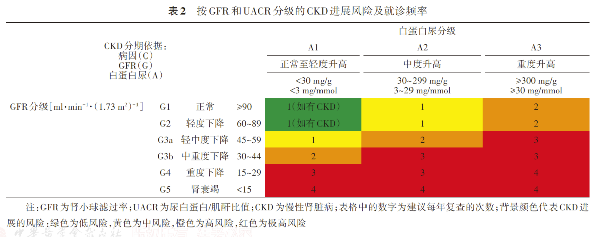 糖尿病腎病的分期按照腎臟病改善全球預后(KDIGO)指南建議聯合慢性腎臟病CKD分期(G1~G5)和白蛋白尿分期(A1-A3),描述和判定糖尿病腎病的嚴重程度。