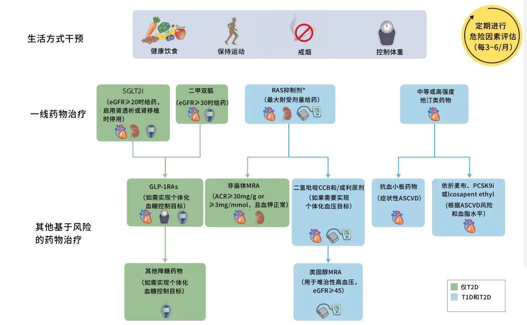 相關指南建議2型糖尿病和1型糖尿病(病程超過5年)患者應每年至少檢查尿常規、UACR和血肌酐(計算eGFR)一次。同時重視對糖尿病腎病危險因素的干預,包括高血糖、高血壓、肥胖(尤其是腹型肥胖),避免腎毒性藥物及食物、急性腎損傷、蛋白攝入過多。研究表明,良好的生活方式、有效的血糖和血壓控制是防治糖尿病腎病的關鍵。