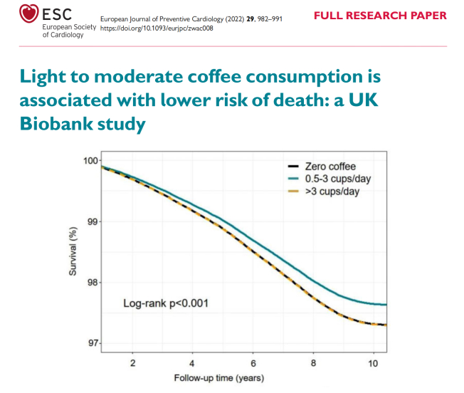 發(fā)表在歐洲預(yù)防心臟病雜志上的研究《Light to moderate coffee consumption is associated with lower risk of death:a UK Biobank study》指出,每天喝少量至中量(0.5-3杯/天)現(xiàn)磨咖啡的人,心血管疾病死亡風(fēng)險(xiǎn)顯著降低;而經(jīng)常喝速溶咖啡的人,全因死亡率和心血管疾病死亡風(fēng)險(xiǎn)并沒有降低。